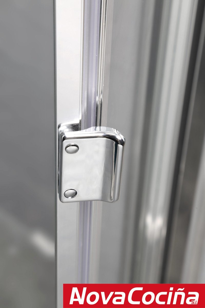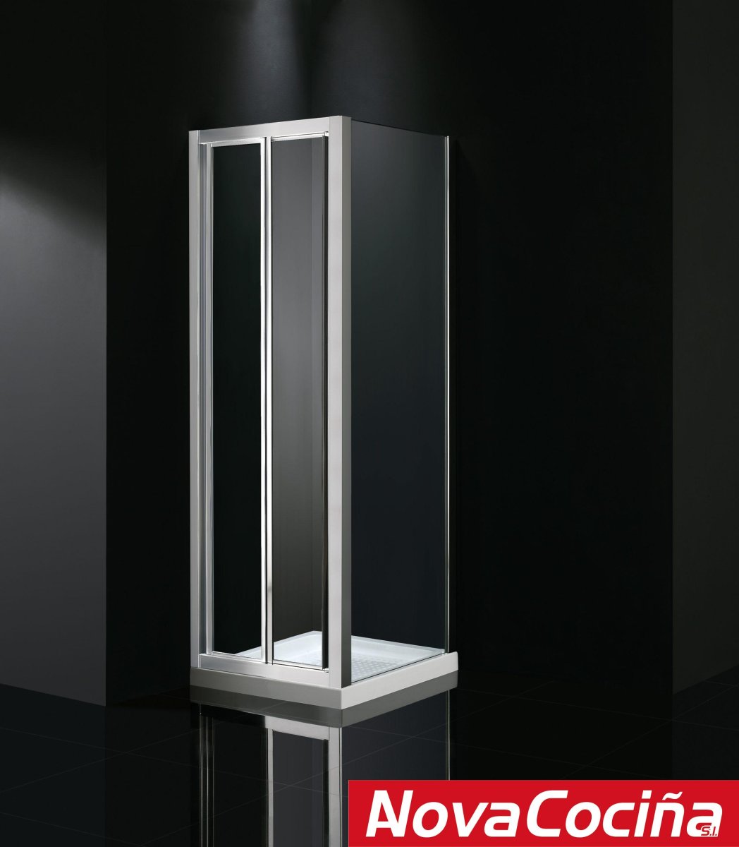 Mampara angular frontal + lateral fijo Akord GME de aluminio compuesta por dos puertas plegables y un lateral fijo.